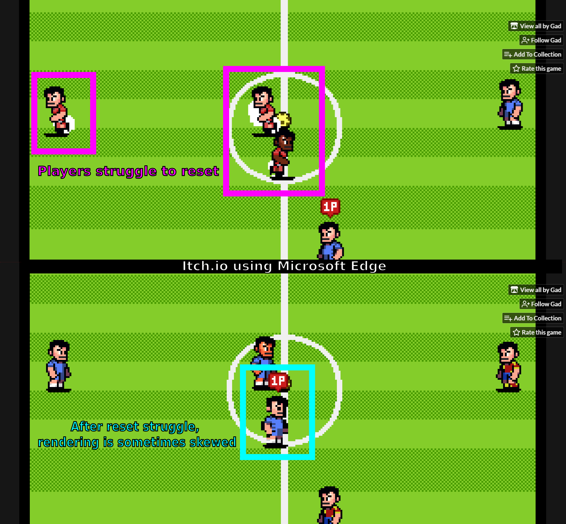 I'm finding weird gameplay behaviors on itch.io that I'm not experiencing locally through Godot on my PC.(I am using Microsoft Edge, and hardware acceleration has been toggled off and on.[Edit: I believe the issue I had was I was not restarting my browsers when I toggled graphics acceleration.]The same issues arise on Google Chrome)Not only is there lag on itch.io, but I'm finding players are not resetting at the start of games (or between goals). They continually run back-and-forth in place. If they manage to escape this, they occasionally render not as expected.Would you know if this is an issue on my end, or is it an issue that Godot has on various browsers/devices? I am following your amazing YouTube Tutorials but my issues here are making me worried for potentially testing my end product.You have done amazing work with this game and your course!! This is awesome stuff and is very much a cool niche!!